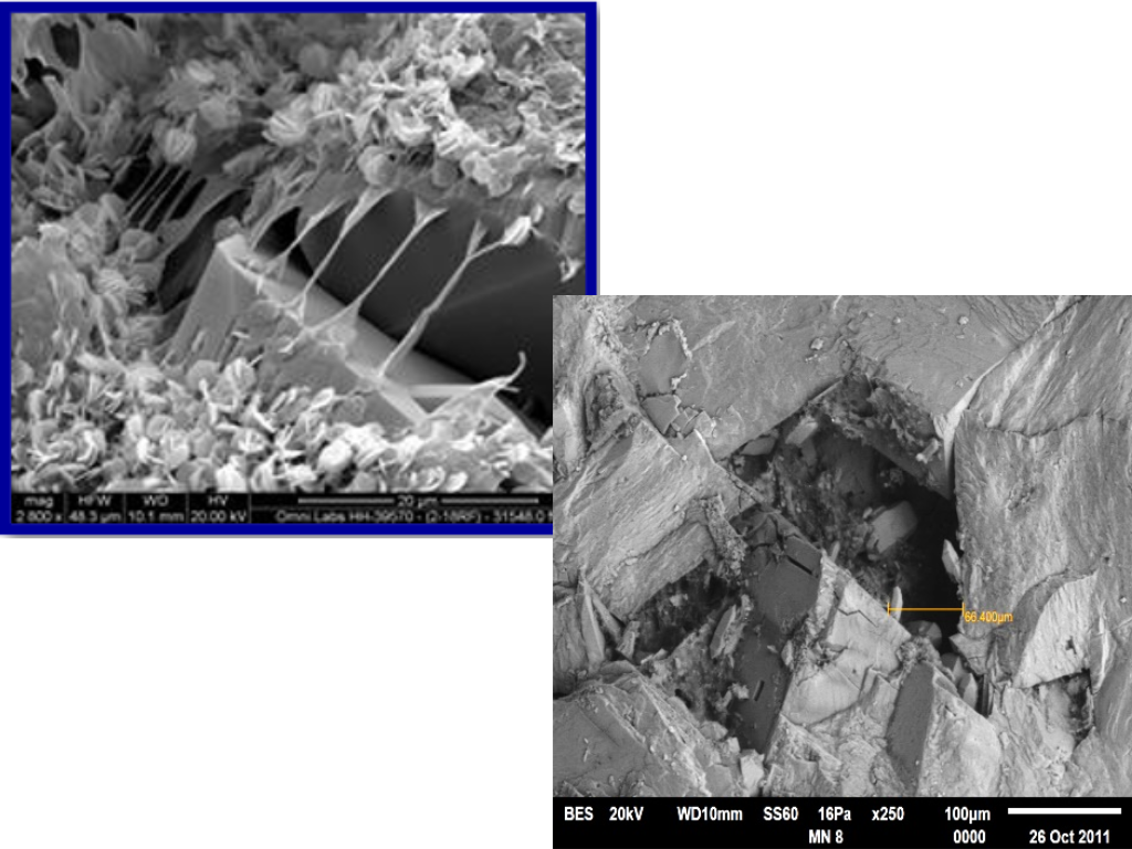 - Con base en la morfología se identifican las arcillas autigénicas expansivas (ilita, esmectita, clorita), y estables (caolinita) y sus relaciones con la porosidad y la permeabilidad.